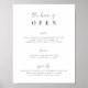 Invite a sus huéspedes a tomar una libación favorita del bar con nuestro encantador cartel de menú de bar boda. El poster 11x14 muestra "el bar está abierto" en un guión de caligrafía negra y letras en bloques. Personaliza con tus selecciones de bebida debajo.