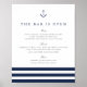 Diseñado para adaptarse a nuestra colección de bodas Nautical Mix, este elegante cartel de estilo costero es perfecto para ubicarse en el bar y compartir su selección de vinos, licores y cerveza con los huéspedes. Personalice el encabezado y seis campos de texto, adornados con un trío de rayas azul marino náutico y un ancla en la parte superior.