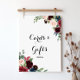 Este otoño, las rústicas tarjetas y el signo de los regalos son perfectos para una ducha moderna de boda o de novia. El diseño es de color burdeos, rojo, marino, azul y ondulante radiante y flores elegantes pintadas a mano, inspirando la belleza natural. Haz que la línea de texto en la parte inferior del cartel sea tuya, incluyendo la fecha, los nombres de la novia y el novio o un mensaje corto como "Gracias". Este signo puede complementar a un boda, cualquier evento o fiesta.