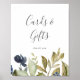 Este signo de regalo y tarjetas verdes de otoño es perfecto para una boda en otoño o una ducha de novia. El moderno diseño rústico incluye hojas azul marino, verde salvia y dorado con brotes de flores azules oscuras. La línea de texto al final del cartel puede ser personalizada con la fecha, los nombres de la novia y el novio, o un mensaje corto como "Gracias". Este signo se puede usar para un boda o para cualquier evento o fiesta.