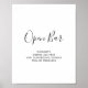 Este minimalista letrero de barra abierta es perfecto para un boda sencillo. El moderno diseño romántico presenta una tipografía clásica en blanco y negro, acompañada de una caligrafía rústica y elegante con un estilo de letra a mano vintage. Personalizable de cualquier color. Mantenga el diseño simple y elegante, tal como está, o lo personaliza añadiendo sus propios gráficos y obras de arte.