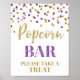 Cartel de la barra de palomitas para la ducha de bebé, la ducha de novia, la fiesta de cumpleaños o el boda en color morado oscuro y confetti dorado. Tenga en cuenta que el efecto purpurina es sólo efecto fotográfico.