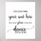 Este sencillo rótulo en la pista de baile de la plaza negra es perfecto para un boda rústico o moderno. El diseño minimalista incluye un elegante guión de broche y un bonito corazón femenino. El cartel dice "puedes encontrar tu asiento aquí, pero tu lugar está en la pista de baile". Envuelva este cartel y colóquelo en la mesa de recepción con sus tarjetas de visita.