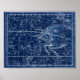 Taurus zodiac firma ilustracion gráfico vintage con estrellas y constelaciones sobre un fondo azul oscuro.