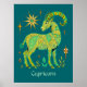 Poster en una representación estilizada de una cabra, intrincadamente decorada con patrones de verde y amarillo, representando el signo zodiaco Capricornio. Los elementos que lo rodean incluyen símbolos celestes y diseños de hojas.