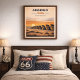 This premium Route 66 poster features the world-famous public art installation of upright vintage cars in Amarillo, Texas. This striking poster captures the ten classic automobiles buried nose-first in the Texas panhandle soil, set against a vast and glowing prairie sunset. Rendered in a nostalgic, textured style that celebrates the quirkier side of the Mother Road, this high-quality poster is a must-have for art lovers, road trip enthusiasts, and collectors of vintage Americana. Designed with a weathered finish to honor the 100-year anniversary of the highway, this professional-grade poster is perfect for a home office, gallery wall, or living room. Celebrate the 1926-2026 milestone with this sophisticated tribute to one of the most unique and photographed landmarks along the legendary 2,448-mile journey.