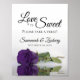 Este hermoso poster o cartel es perfecto para una mesa de huéspedes en la recepción de su boda. Presenta un diseño sencillo pero elegante con letras de guión y una foto de un solo rosa de color púrpura real profundo de tallo largo reflejado en un estanque de agua. El cartel dice: ¡El amor es dulce, por favor tómate un regalo! Hay sitio para sus nombres y la fecha del boda a continuación.