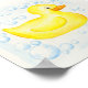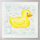 Pato de caucho amarillo lindo rodeado de burbujas, listo para enmarcar y colgar en la pared de tu baño.