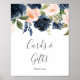 Este signo de regalo y tarjetas blancas con flores de color azul y marina es perfecto para un boda floral o una ducha de novia. El diseño es clásico y elegante y cuenta con un acuarela de color azul marino moderno y flores rosas de color rosa. La línea de texto al final del cartel puede ser personalizada con la fecha, los nombres de la novia y el novio, o un mensaje corto como "Gracias". Este signo se puede usar para un boda o para cualquier evento o fiesta.