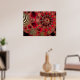 Un brillante diseño fractal con espirales ornamentales de rojo oscuro y vívido, recubierto de fibra de oro como conchas metálicas y lleno de rúbricas brillantes.