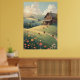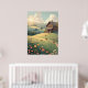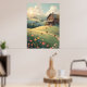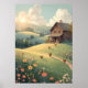 Bring a touch of quiet country life into your home with this charming summer landscape artwork. The scene features a cozy wooden cabin nestled in rolling golden hills, surrounded by lush forests and bright wildflowers swaying in the breeze. Chickens roam freely in the sunlit meadow, adding warmth and life to the peaceful setting.
