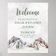 An elegant sign to welcome your guests to your rustic winter wedding with a snow covered country mountain scene.