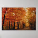 Árboles otoñales de oro amarillo que bordean un camino de tierra.