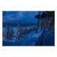 Paisaje invernal con pinos y abetos cubiertos de nieve a la luz de la luna en noche estrellada. Vista panorámica del bosque de coníferas con camino de madera cerca de la costa del mar contra el hermoso cielo nocturno con estrellas