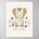 Bring an air of peaceful, loving charm to a young child's room with this beautiful elephant portrait print. The artwork features a sweet, stylized elephant adorned with tribal-inspired markings. The soft, neutral tones of cream and tan contrast beautifully against the calming, ivory white background. Surrounded by simple botanical accents, the print includes the heartwarming caption, "BIG HEART," making it a perfect addition to a modern, gender-neutral, or safari-themed nursery or playroom. Part of our coordinated 'Kid's Safari Decor' collection. Note: design adapted from generative content.