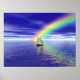 Sailboat sailing toward a vibrant rainbow.