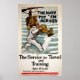 Afiche de época que muestra a un marinero varado mientras lleva a un soldado en el hombro. La Marina los puso a través del servicio para viajes y entrenamiento, de 17 a 35 años