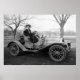 Foto de moda de una mujer identificada como Miss R. Maycliffe, con un enorme abrigo de piel, gorra y bonito auto viejo, a principios del siglo XX.