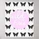 Elegante diseño negro, blanco y rosa con fondo de baldosas de mariposa en silueta. La superposición de círculo rosado actúa como lienzo para la inscripción caligráfica blanca, permitiendo que aparezca el mensaje "Salvaje y Libre". Perfecto para cualquier habitación en un dormitorio o casa.