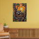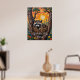 Esta pintura imaginativa captura un mapache con sus patas reposando en el borde de un nido de aves. La expresión del mapache es a la vez inocente y maliciosa, perfectamente encapsulada por el texto "'Cute but feral'" escrito en una audaz y llamativa fuente amarilla. El nido mismo está intrincadamente tejido, con pequeñas hojas verdes adornadas, colocadas sobre un fondo de madera oscura y texturada.