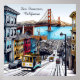 Ai art retratando una panorámica de San Francisco, el puente de California, el agua y los edificios.