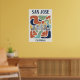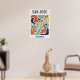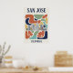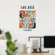 A stylish and colorful graphic poster featuring the San Jose skyline and the name California. The artwork utilizes a popular mid-century modern style, characterized by abstract, organic shapes in a warm and earthy color palette (terracotta, olive, mustard, navy).