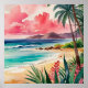 Es una playa tropical tranquila, con arena dorada y olas turquesas. Hay palmeras exuberantes bajo una puesta de sol verde azulada y rosa de ensueño. La escapada perfecta para los amantes de la playa y de la brisa marina.