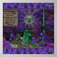 Pirámide, sol, hombre verde en medio de un bosque morado y verde azul con el texto "Es la sangre de los antiguos que recorre nuestras venas y las formas pasan pero el círculo de la vida permanece". Uno de los meses en el calendario de las Diosas de la Naturaleza.