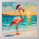 Retrato caprichoso de un flamingo delgado, su forma elegante ilustrada con suaves y delicados rosados y cremosos blancos, sobre una playa cubierta de sol. Encaramado en la cabeza hay un sombrero de Santa Festividad brillante, terciopelo rojo y pieles blancas, un sorprendente contraste con las plumas de los pájaros. El fondo se desdibuja suavemente en los tonos cálidos y dorados de un sol que se refleja en las aguas tranquilas y poco profundas de color turquesa, ilustradas con brochas holgadas e impresionistas que evocan una sensación de serenidad en las vacaciones.