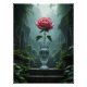 Representación fotorrealista de un olvidado jardín de la selva, envuelto en una espesa y atmosférica bruma. Las ruinas de piedra antiguas recorren una densa vegetación, destacando la edad y el misterio de la ubicación. En el centro, encima de escalones de piedra empañada, se encuentra un gran jarrón de cristal ornamentado, con facetas impecables y reluciente en la luz difusa. El jarrón tiene un rosa único y majestuoso en plena floración, pétalos de color rosa rosa vibrante y salpicados de delicadas gotas de agua. El filtro de luz a través del abrevadero de niebla interactúa con el cristal, refractándose sutilmente a los verdes y a los rosados en suaves y mágicos prismas a través de la superficie de piedra. La escena evoca serenidad, belleza intemporal y la maravilla de un jardín oculto y encantado.