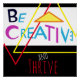 Acepta tus genuinos internos. "Sé creativo y valiente" expresa lo importante que es mirar las cosas -ya sea en tu vida, tu trabajo o tú mismo- de maneras nuevas y a veces inusuales. Este mensaje inspirador aparece en un diseño abstracto geométrico en formas triangulares de tonos rojos, amarillos, azules y magena rosados sobre un fondo blanco y negro.