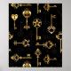 Seamless pattern of antique, gold and silhouette keys on black background.