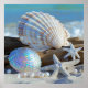 Bonitos Castillos, Starfish, Coral y marisco a la deriva en una playa de arena blanca.