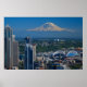 Hermoso Poster que muestra una fotografía de Seattle con el Monte Rainier al fondo.