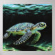 Este poster presenta una pintura al óleo de una serena tortuga marina nadando bajo el agua.