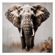 Un majestuoso elefante africano camina con calma y dignidad a través de la sabana, su imponente presencia refleja la fuerza y la sabiduría de la naturaleza. El polvo dorado levantado por sus patas y el cielo interminable en el fondo crean una escena serena y poderosa, celebrando la grandeza de la vida silvestre