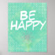 Sé Poster de Citas Felices. El fondo de un punto de polka verde angustiado inspirado en un ambiente rústico con un overlay verde angustiado que dice 'Be Happy' en texto blanco, acentuado con una flor rosa dibujada a mano. Mensaje motivacional y inspirador.