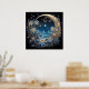 Esta intrincada pintura digital, "Serenidad de media noche", captura un impresionante paisaje nocturno. Una luna creciente y un cielo estrellado están enmarcados por motivos florales ornamentados en tonos azules y dorados. La escena evoca una sensación de calma mágica y belleza, perfecta para un poster que le aporta un toque etéreo a cualquier habitación.