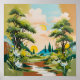 Escape a un mundo de tranquilidad con esta vibrante y onírica pintura paisajística. La vegetación exuberante, un lago brillante y un doble sol crean una sensación de asombro y asombro. Esta pieza es perfecta para añadir un toque de naturaleza y serenidad a su casa o oficina.