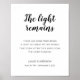 Esta elegante señal conmemorativa, con su conmovedora cita "La luz permanece", es una forma hermosa de recordar y honrar al ser querido en la celebración de la reunión de vida. Personalice con su texto en la parte inferior.