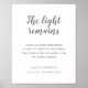 Esta elegante señal conmemorativa gris y blanca, con su conmovedora cita "La luz permanece" es una hermosa manera de recordar y honrar al ser querido en la celebración de la reunión de la vida. Personalice con su texto en la parte inferior.