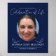 Celebración de la vida servicio memorial cartel ovalado en azul marino oscuro, azul cielo y blanco. Personalice con el nombre y una foto de su ser querido en un marco ovalado más fecha de servicio o fechas de vida. Foto flanqueada por dos corazones que se curvan. Otras opciones de color están disponibles o se pueden crear a petición. Arte y diseño original de www.mylittleeden.com