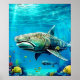 Experience an emotional underwater encounter with this detailed, stylized shark art print. The artwork showcases the ocean's apex predator gliding through sun-drenched deep blue light, contrasted by vibrant, colorful coral and tropical fish. This captivating scene masterfully blends power with the serene beauty of the marine environment, making it a compelling piece of ocean-themed decor. This truly unique design began with advanced AI generation and was then meticulously edited by a skilled artist to enhance its uniqueness, texture, and creative depth. This process ensures a distinctive, high-quality marine art print. Perfect for anyone who loves the ocean's mystery and power. Place your order today and embrace the joy of owning this exceptional piece!