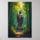 Esta obra de arte, bañada por una luz dorada y etérea, le invita a entrar en un tranquilo bosque japonés de bambú. Alzadores tallos de verde vibrante forman una catedral natural, sus hojas se agitan suavemente en la brisa. En el corazón de este sereno bosque, una magnífica estatua de Buda se erige como un faro de paz y sabiduría antigua. Un sinuoso sendero de piedra acristalada conduce a la estatua, lo que hace que el espectador se encuentre en un camino de contemplación tranquila. La escena general es de profunda quietud, donde los mundos sagrado y natural se encuentran en perfecta armonía.