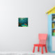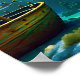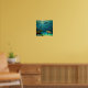 This serene poster features an underwater scene with a school of vibrant blue fish swimming near a sunken shipwreck, accompanied by a sea turtle gliding peacefully above the ocean floor. Finished as a mixed media art print.
