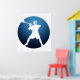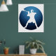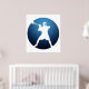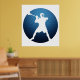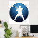 Lacrosse Shooter. Locked, cocked and ready to rock. Silhouette of lacrosse player holding stick, in the midst of firing a shot on goal. Circular emblem design in blues with emanating rays. Lacrosse poster print .