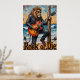 Esta dinámica obra de arte retrata a un león, luciendo sin esfuerzo fresco con gafas de sol y una chaqueta de cuero, "triturando" magistralmente una guitarra eléctrica mientras se apoya contra un asta de madera. La escena se despliega en una playa de arena con texturas de olas oceánicas y un cielo azul sobre el cielo. El grueso y expresivo deterioro crea una textura tangible, haciendo que la declaración "Rock or Die" resuene con la energía cruda de la actuación