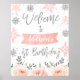 Invierno de Onederland First Birthday Welcome Sign poster o cartel de bienvenida de invierno de color rosa dulce y plata en tierra firme con arreglo floral rosa y copos de nieve rosados y plateados. Esta es una manera dulce de saludar a los invitados de tu niñita cuando llegan a su fiesta de cumpleaños onerosa de invierno.