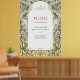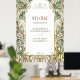 Este impresionante cartel boda de estilo Art Nouveau presenta un elegante diseño de arco floral. Delicadas flores blancas y exuberante vegetación se entrelazan con acentos dorados para crear un marco sofisticado e intemporal para tu mensaje de bienvenida. Perfecto para la temática boda de inspiración natural, vintage o romántica, este diseño floral pintado a mano aporta un toque de elegancia a su día especial. El clásico estilo Art Nouveau y la armoniosa paleta de colores verde, dorado y blanco hacen de este signo una bonita pieza decorativa para su decoración boda.