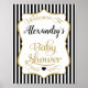 Un elegante cartel de bienvenida a una ducha de bebé con franjas blancas negras y guarnecido purpurina dorado con un nombre personalizado para la futura mamita. El diseño de un remolino dorado de bonito con corazón en el centro hace de este seño de ducha de bebé una forma encantadora de presentar a los huéspedes su ducha formal para bebés. Se pueden encontrar más artículos en negro y oro en mi tienda.